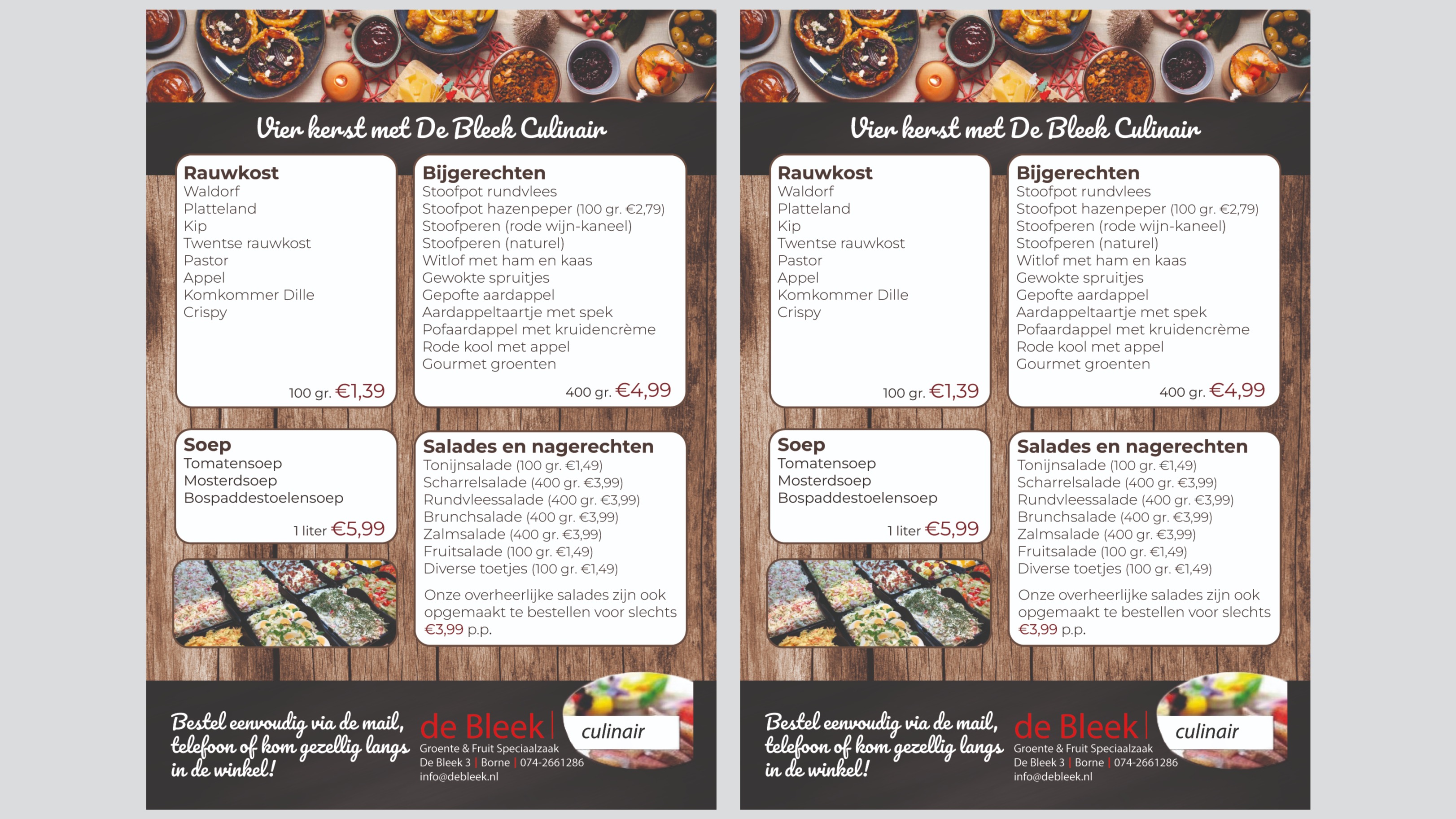 De Bleek Culinair is een winkel met verse groenten en fruit, salades en maaltijden. Zij maken overheerlijke kerstbuffetten waarvoor ik de folder verzorgd heb.